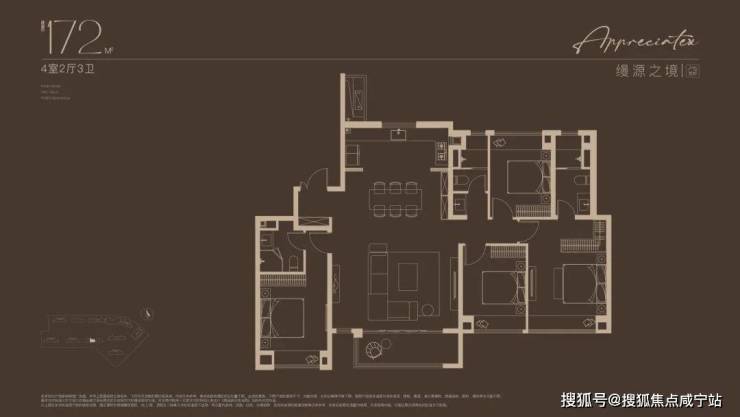 建面约172㎡4房户型,多娃家庭的进阶之选!奢阔尺度尽显家族气度!2梯2户, 子母双开门礼序入户,私密尊崇门厅;约16米四开间朝南,搭配约6米尺度横厅,揽四时风景入怀。