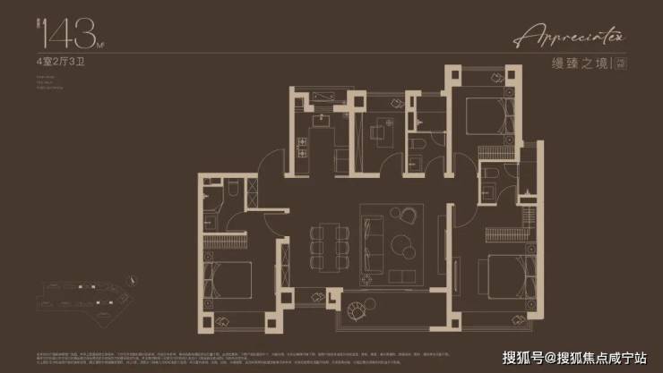 建面约143㎡四房设计,不论是三代同堂还是二娃家庭,都舒居无忧!2梯2户的设计, 极具私密性的入户门厅,彰显大宅归家礼序 。独立玄关,既是归家仪式感,更添收纳空间;约14米朝南面宽,搭配约7米尺度横厅,尽显大宅风范; 东西双套房设计,奢享全龄世家的静谧时光。