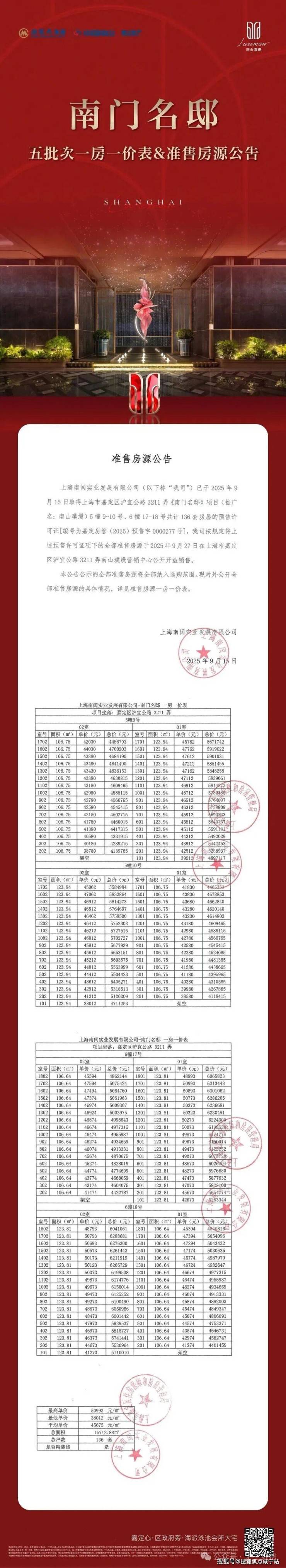 最新消息:南山璞缦项目五期加推105-123㎡3房户型,共136套房源,过会均价均价45675元/㎡;另前期少量105-198㎡3-4房在售,总价365万起,可直接认购!作为嘉定新城封面豪宅产品,项目备受购房者的关注!