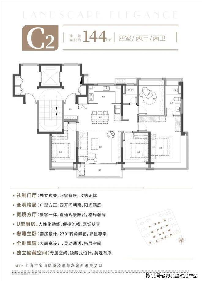 大尺度聚合方厅,为全家人打造陪伴高能的欢聚场;U型厨房,与一体化客餐厅、宽景阳台贯通,令家居动线更开阔流畅;奢雅主卧套房,270°转角飘窗视野,主人品位与格调尽情绽放;隐藏式独立储藏空间,可更轻松、有序收大件物品。