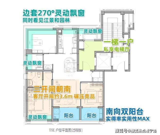 更大的亮点在于双转角飘窗与双阳台的多重暴击。