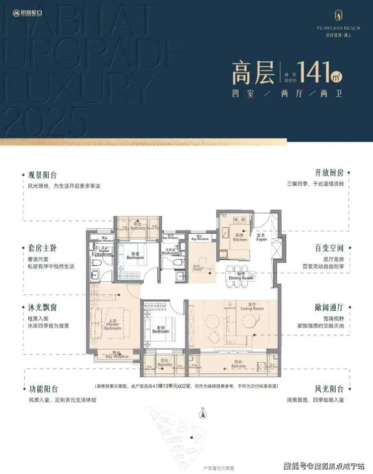 建筑面积约105㎡三房,进阶改善绝版“三阳台”户型,主力总价段约700万级,部分房源总价约650万级。