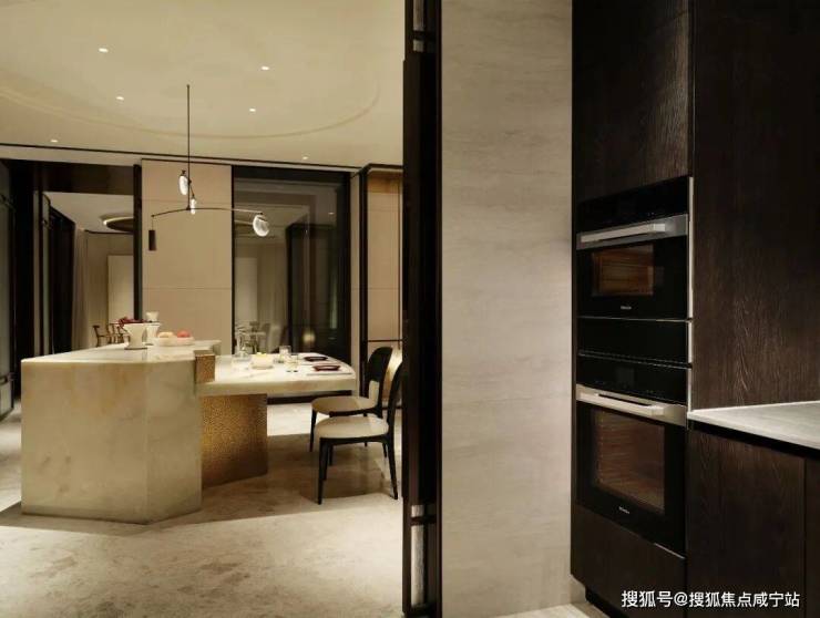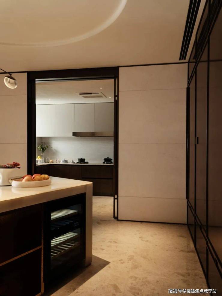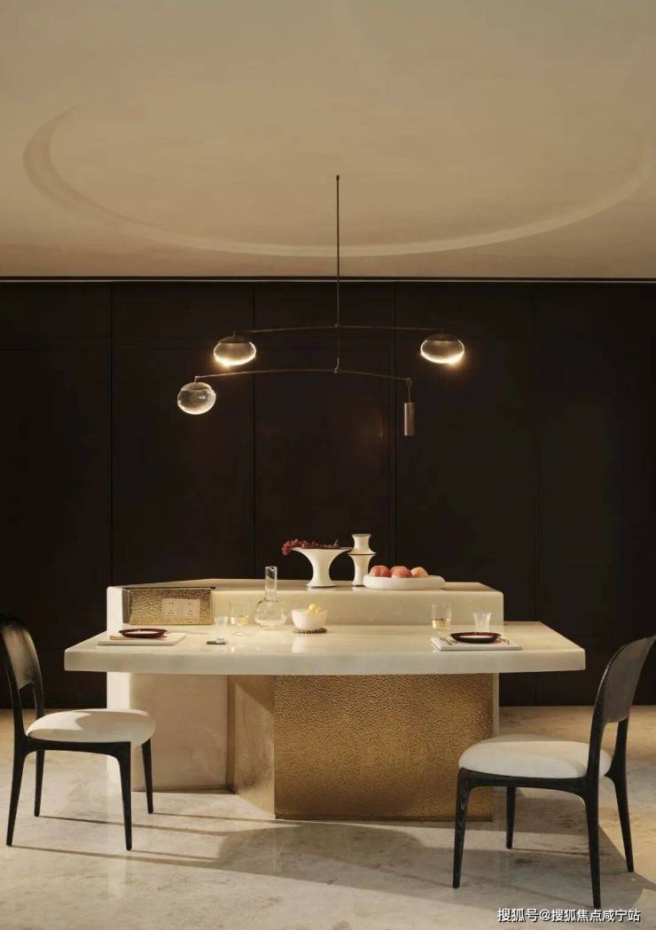 会客厅右侧延伸出西厨空间,白玉岛台以高低形态演绎,与具有手工捶造感的亮铜包边相嵌合,四方玉石灯具形成元素的联通。