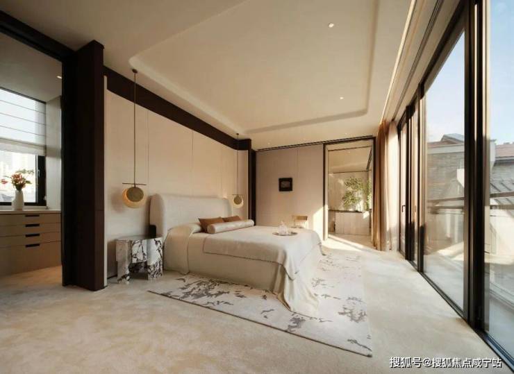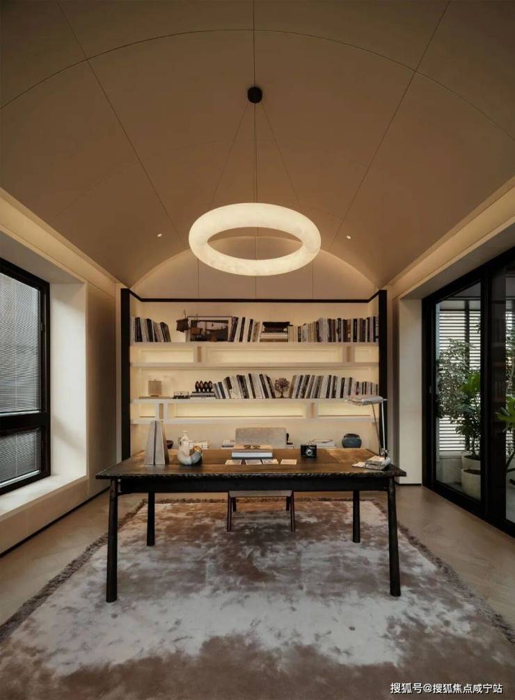 进入米金色的正厅,四组定制款落地玉石灯具围合出一方天地,也将前后庭院的景致框成家中逸动画作,润泽质地为场域注入东方底蕴。柔灰的大理石地面,流畅的吊顶流线,与硬挺的金属构件形成刚柔对话。