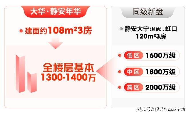 静安大宁、虹口新盘,3房总价约1600万起,若想买中区房源,要到1800万级;而大华·静安年华108㎡3房,全楼层总价基本1300多万,门槛温柔太多。