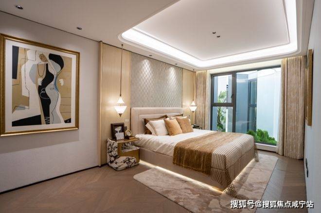 另外,像卧室地板,没有采用常规横拼、竖拼,而是采用复杂的斜拼,只为更美观;吊顶设计同样暗藏匠心,采用多层次曲边造型,为空间增添优雅的线条感。