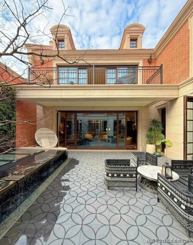 整个泳池天花板,呈现出海派拱形元素,落地玻璃窗外,是下沉式的景观空间: