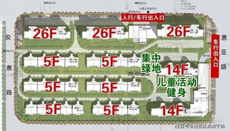 根据公示图显示,该项目的4个小板块最高层为项目东南角和西北角的26层高层,共有6栋,高度接近地块限高的80米(77.80米);18层的共有8栋;17层共有6栋;14层共有4栋;13层共有2栋;6层的共有4栋;5层的共有8栋。