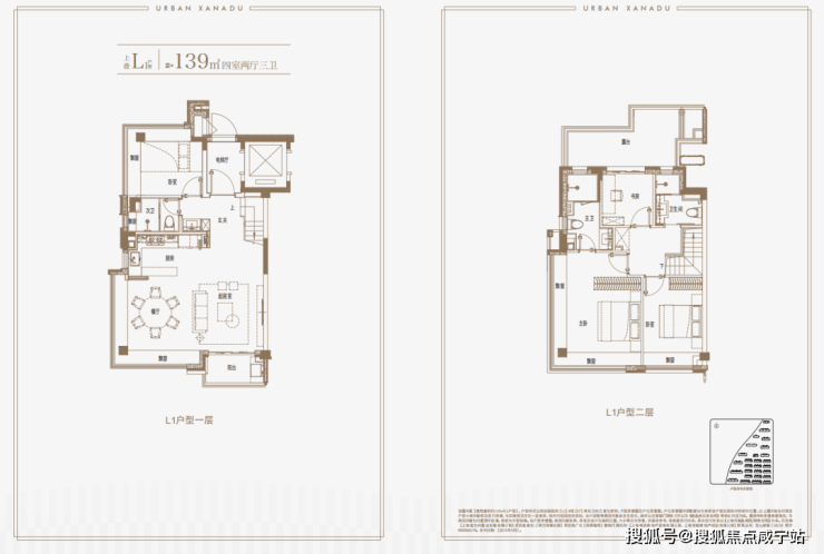 建面约139㎡上叠户型,三层是会客区,四层是居住区,阳台+露台+多个飘窗设计,附加空间非常大,在别墅类产品中实属罕见!