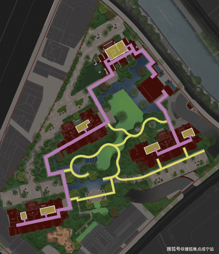 社区约3000㎡的中心花园和6大艺术花园,不仅让每栋楼都享受“楼王”的待遇,且自然勾勒出一条漫游式的公园归家动线(黄色线条走向)