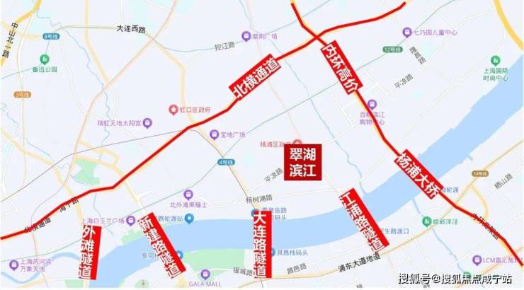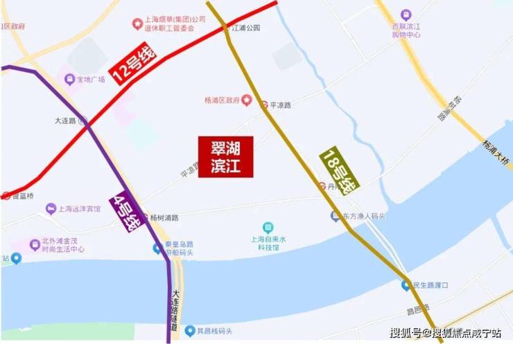 交通方面, 周边1公里内有多条轨道交通,东侧约400米有18号线平凉路站,西侧约700米是4号线杨树浦路站,西北侧1公里为4、12号线大连路站。地块到东外滩滨江的直线距离约580米!