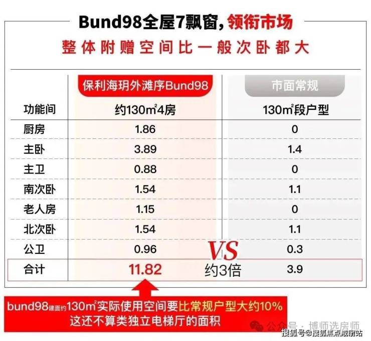 相比常规户型只是全卧飘窗布置,Bund98户型不仅厨房带飘窗,主卧和两个卫生间更带双侧采光的270度飘窗,总共七个飘窗,飘窗不计入建筑面积,附赠远超常规户型。