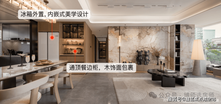 比如墙面使用大量温润木饰面铺陈,电视背景墙选用岩板,客厅地面铺设云朵拉灰石材、餐边柜台面镶嵌卡里冰玉大理石,将高级感渗透到生活的每个角落。