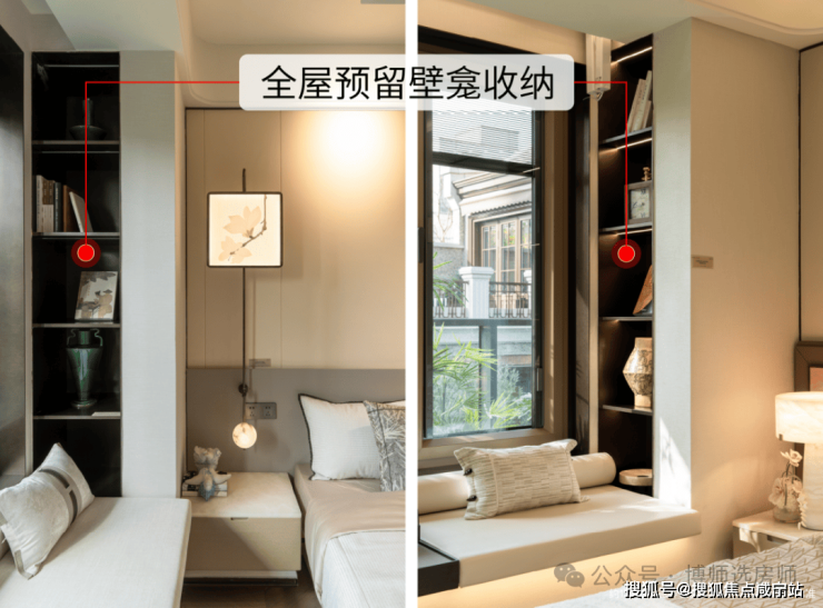 又比如,卧室预留壁龛收纳空间,后期可摆放艺术品、相册、香薰、书籍等。