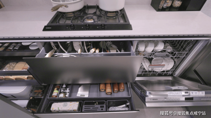 收纳设计,堪称空间魔术!厨房拥有6大超级收纳体系,涵盖镂空门板屯菜柜、伸缩拓展平台、电动调味舱、踢脚抽、倾易抽、双层轨道抽等,让每一处空间都物尽其用!