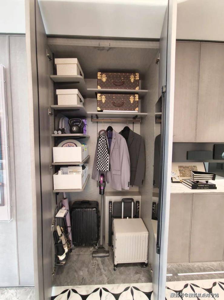 入户时候身上的大衣、孩子的童车、大型的行李箱,都可以置放于此,还贴心设置了换衣镜,加上玄关柜,预计的储物空间约2212L,相当于50个20寸登机箱的容量。