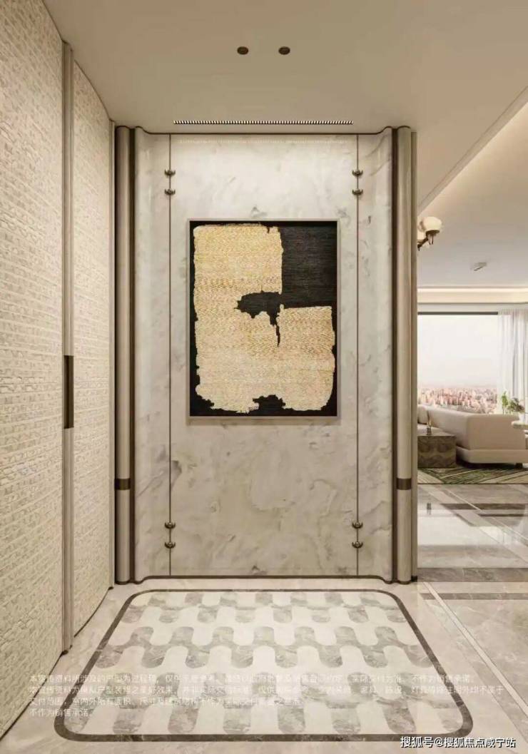 约2㎡玄关拼花采用胜利拱券 × 全水刀工艺!超高压切割让石材切口平整无崩边,结构更稳定,搭配天然石材的高硬度属性,长久使用依旧光洁如新,省去后期维护烦恼。