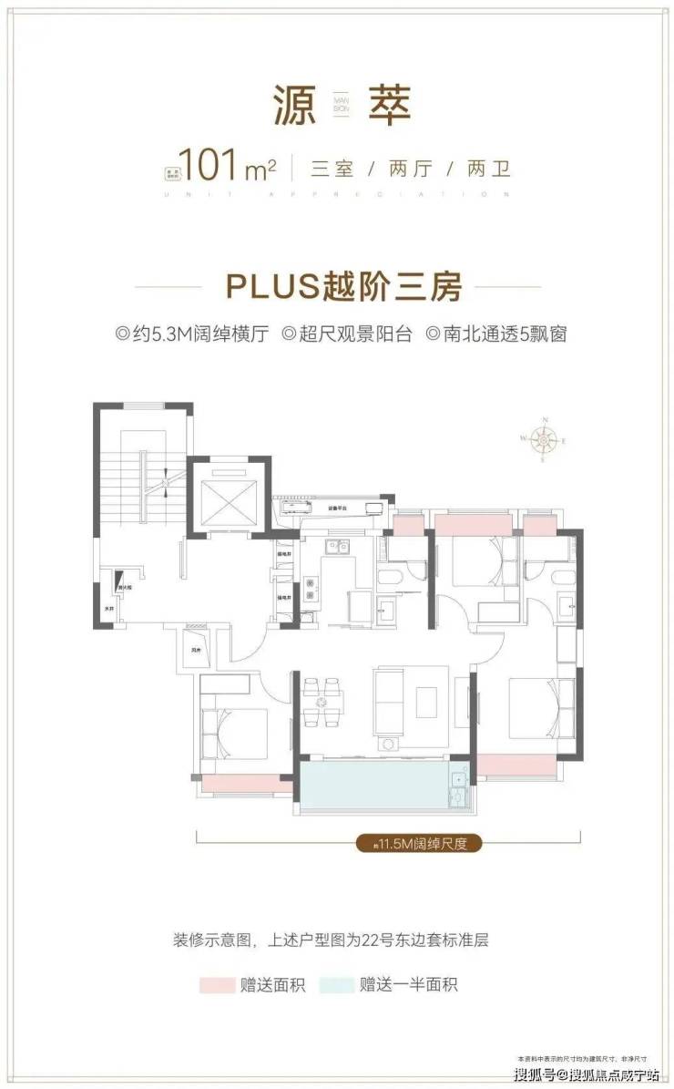 建面约101㎡越阶三房:以5.3米阔尺横厅与11.5米南向面宽为核心设计,南北通透,5个飘窗布局,满足三代同堂的社交与私密需求。