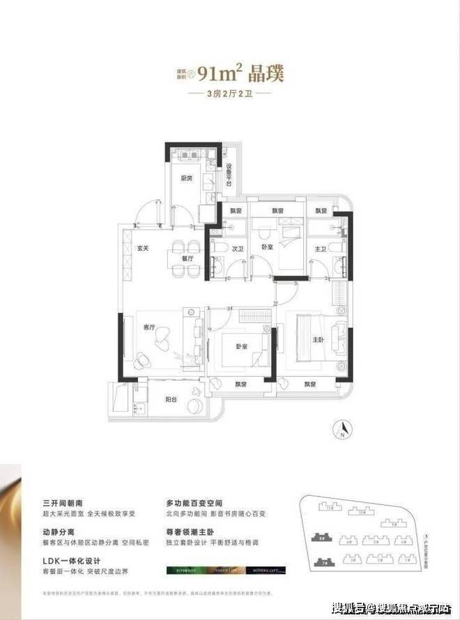 建面约91㎡做3房2卫,三开间朝南、3房5飘窗1阳台,整体室内的采光、视野以及通风都相当出彩。动静分离+主卧套房的设计,保证了整体居住的安静和私密性。