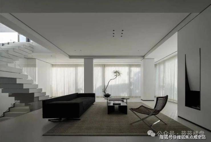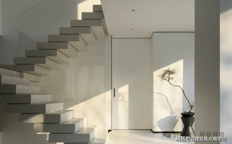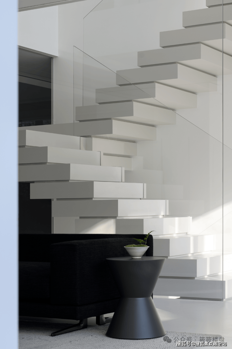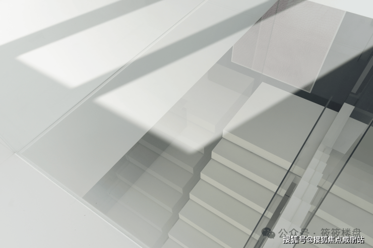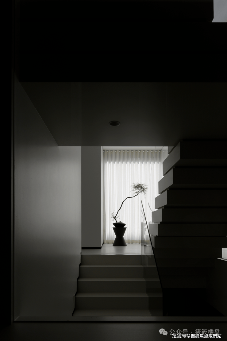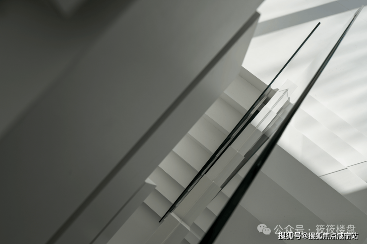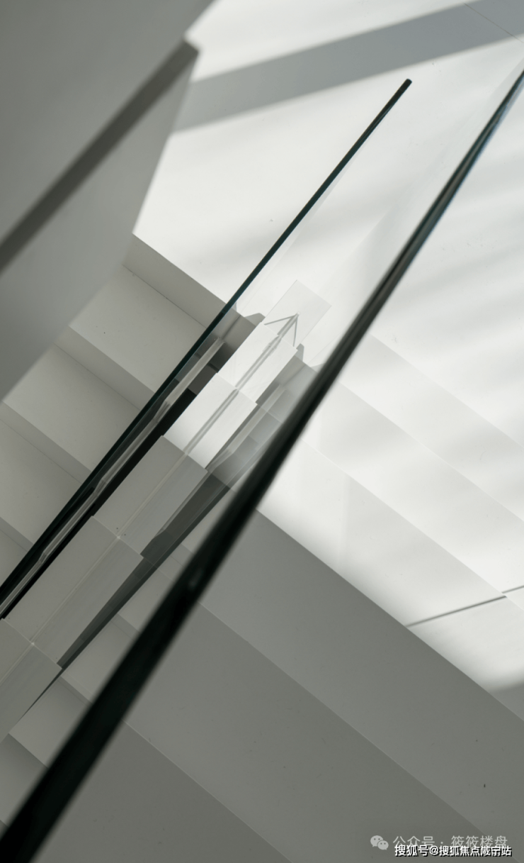 楼梯选用了纯白色,光是唯一的装饰品,在寻常中展现着空间最为纯粹的美。