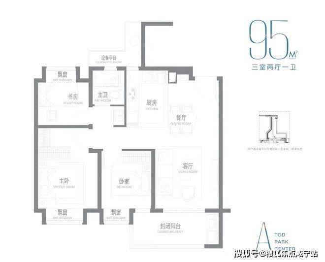户型设计93㎡三房:全明格局,U型厨房+270°环幕阳台,总价约587万起,适合刚需。