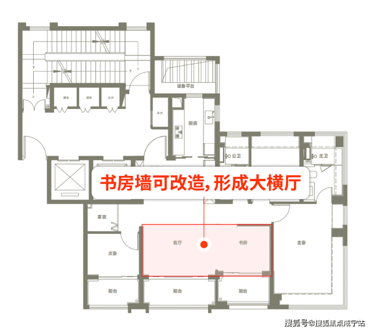 值得一提,靠近主卧的次卧与客厅之间的墙体可灵动改造,若打通则能形成约38平超大横厅,相当于常规180平户型客厅尺度,社交与生活场景随心切换。