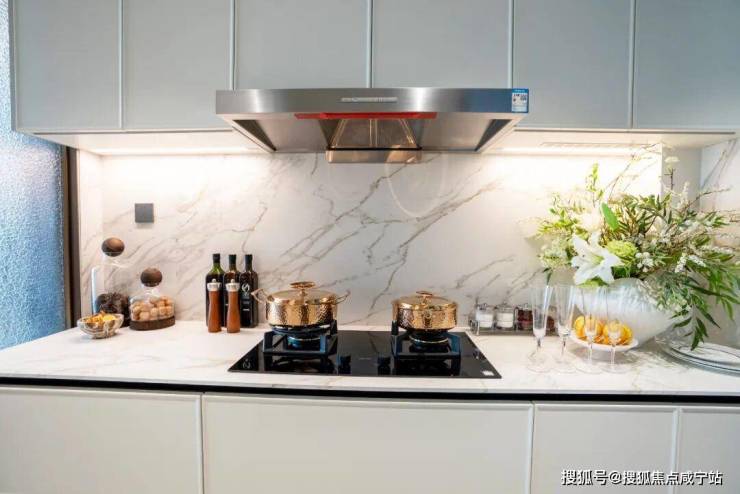 厨房区域标配美诺6件套,涵盖油烟机、灶具、洗碗机、蒸烤一体机、嵌入式冰箱等,搭配威乃达橱柜,厨房”一装封神“!