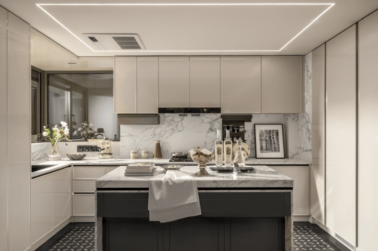 超大尺度的中西岛台,既符合中式烹饪的实用逻辑(预留足够操作台面),又能承载西式社交(朋友小聚时在岛台品酒聊天),让厨房从“单一做饭空间” 变成 “生活场景发生器”。