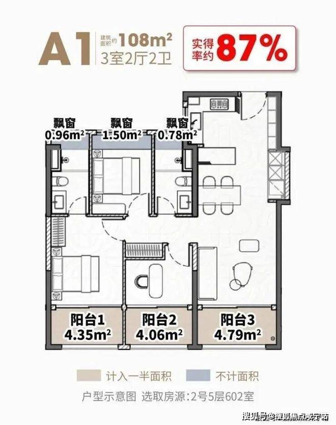 建面约108㎡3房,三阳台面积达约13㎡(赠送一半),飘窗赠送约3.3㎡,室内使用面积达约94.5㎡,实得率高达约87%,总赠送面积比常规次卧都大.