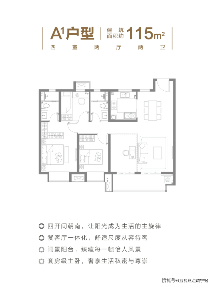 本批次新加推的建面约123㎡的4房2厅2卫户型,则是115户型的进阶版。同样四开间朝南,餐客厅一体化设计,真正的南北通透,尺度感和舒适度更高。
