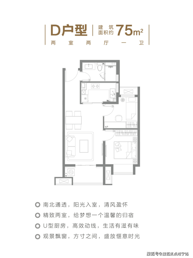 75㎡两房:全明设计,动静分区,主卧飘窗+客厅大阳台延展空间感,总价不到200万。