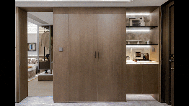 过道的空间也得以充分利用,一整面的过道柜,可作为各类消耗品的收纳中心,如果你是一个爱购物、收藏的业主,在这里,双十一囤再多货也都能放下。
