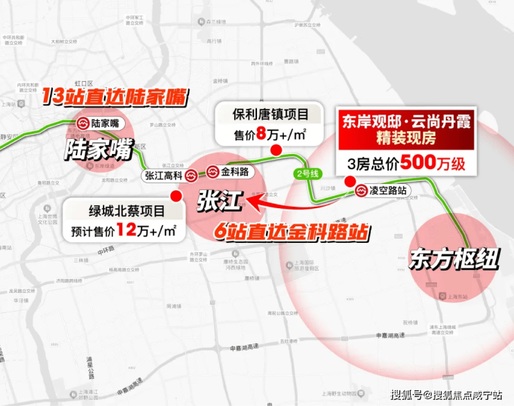 首先向西,川沙可经由2号线承接张江科学城高精尖人才置业需求。并且在唐镇站新房8万+/㎡,创新中路站7.4万+/㎡的背景下,均价约6.4万/㎡的的东岸观邸·云尚丹霞已经形成了巨大的剪头差。