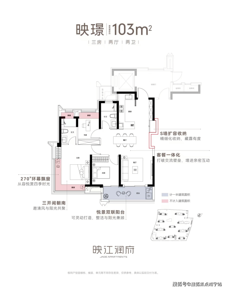 亮点五:双联阳台+多飘窗赠送、灵动空间。映江润府103户型,实现了100平级别难得的双联阳台,实现了室内空间的横向延伸,同时,搭配主卧、主卫、书房的“全飘窗”设计,赋予了空间更多灵动的使用场景。