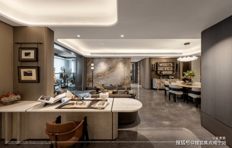 动区铺设1800*900的简一密缝砖,整体视觉统一,搭配交付的岩板背景墙,大气通透。