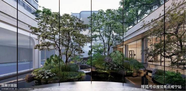 摩登水院,华灯映入水池,映出池底黑金沙的金光色,雍容华贵。下沉花园,打造约8.5m宽观景亭,亭外是苍苍乌桕,秋后丹红一片,业主们可在这里聊天赏景,喝茶小聚。