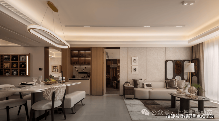 客厅面宽达到约5.8米,客餐厅与南阳台结合形成约50㎡超大会客空间,尺度感堪比常规170㎡+户型。