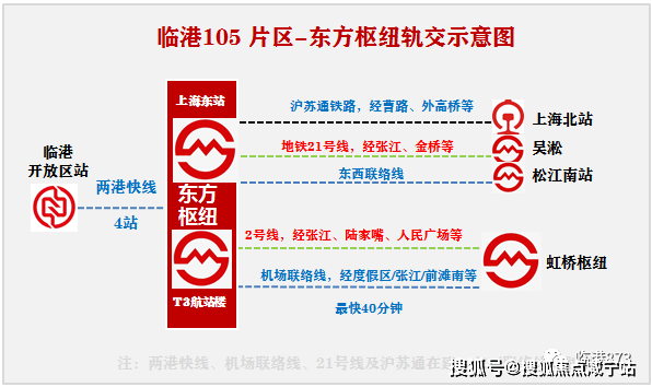 2025年底两港快线通车后,从105开放区站最快15分钟到东方枢纽(来源:浦东发布)。通过东方枢纽这个支点,链接多条轨交(含在建与规划)便捷到达张江、金桥、前滩与虹桥等各个板块!