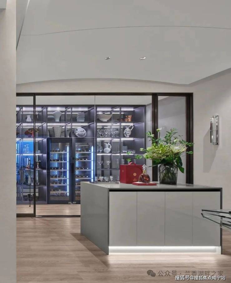 室内设计:超比例挑高客厅,一楼层高4.5米,背景墙嵌入潘多拉天然奢石,全景落地窗引入光影律动。