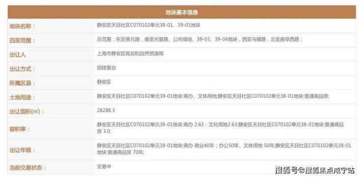 2020年10月,仁恒+华发联合体以42.1亿的价格竞得静安区天目社区,C070102单元38-01、39-01地块,溢价率为1.25%,成交楼面价52833.79元/㎡!