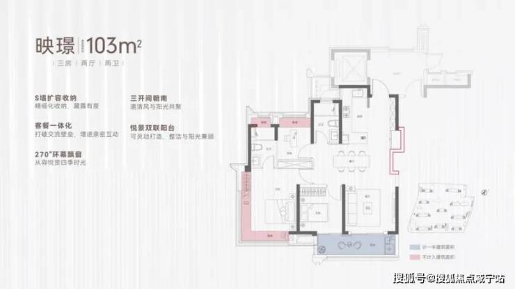 建面约103㎡三房户型则更为推荐!同样的三开间朝南,并拥有超大面宽的双联阳台!客餐厅一体化并设计了洄游动线,缩短了家庭空间的距离,增进了亲密的互动!