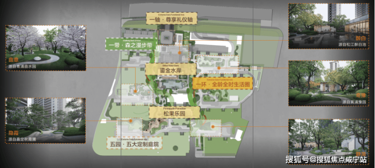 首先是“一轴”:约150米极核心功能轴,串联起了社区内的三大核心景观功能区:无界水院、鎏金水岸及松果乐园!