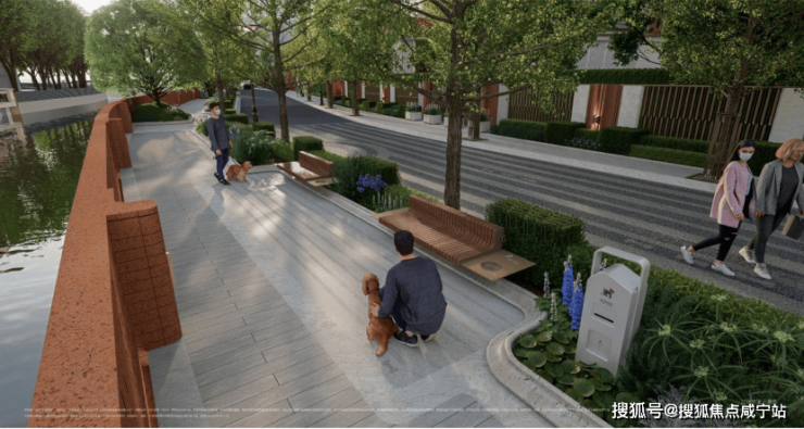 约7000㎡风貌邻里新弄堂延续石库门肌理,将社区咖啡、艺术工坊、便民市集等多元业态融入其中,构建开放、融合的步行尺度共同体—— 文艺氛围与人间烟火在此交织,打破了高端社区的疏离感。而九龙路滨水归家秘境,通过宠物友好花园、文化记忆景墙、适老化座椅