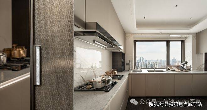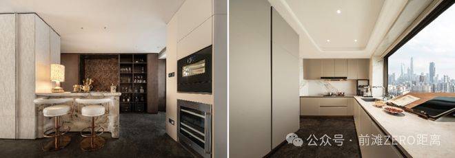 厨房内竹纹夹丝玻璃门威乃达坡璃烤漆橱柜、与卡拉拉金大岩板台面相融,同时嘉格纳十件套满足每一种味蕾的偏好,厨房内,灶台/油烟机/洗机/冰箱(独立分体设计)五件套;向外,嘉格纳咖啡机/暖碟机/酒柜/烤箱/蒸箱等西厨五件套配置,构筑中西共融的烹饪场域。