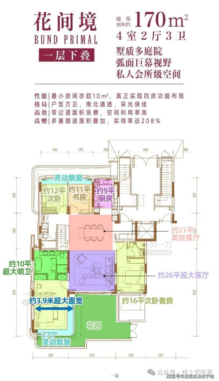 以170m²的一层户型为例,单层约170平的大尺度,带来大平层般的居住舒适度(客厅面宽达5.2米)。