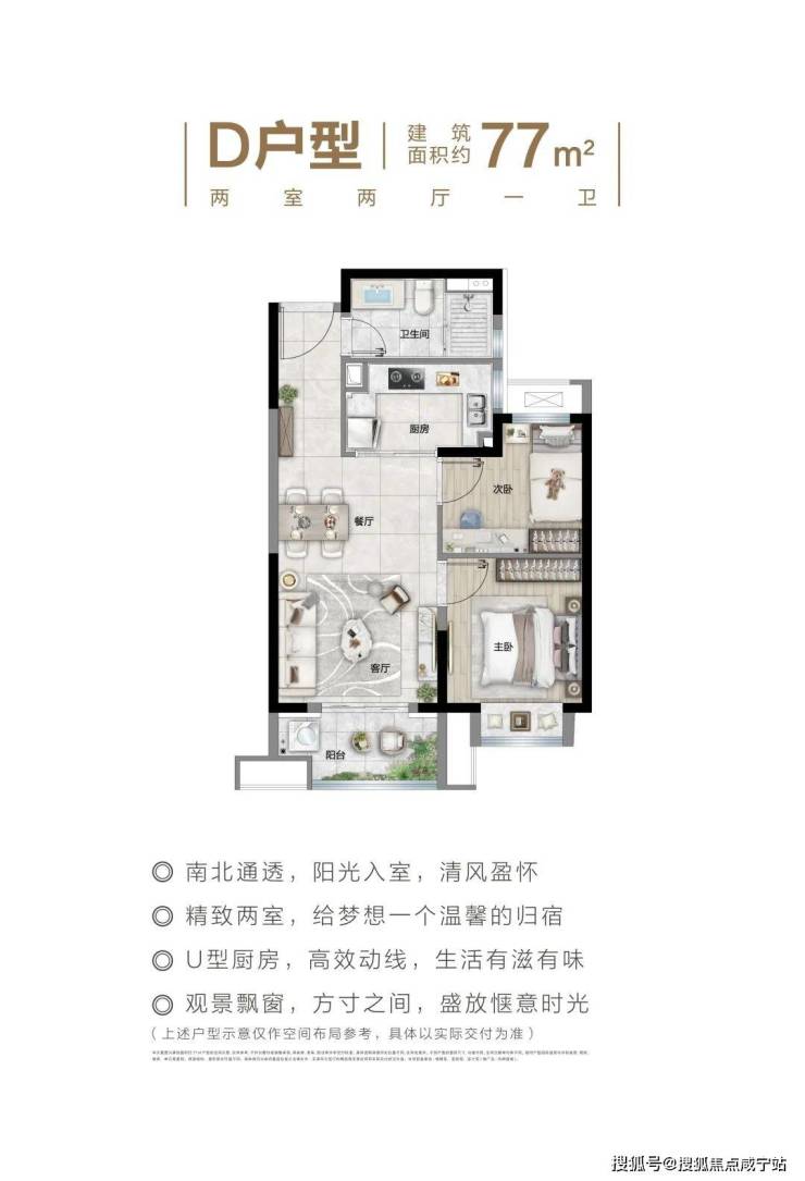 建面约75㎡2房户型,是目前少有的能以超低总价上车的户型。单套总价或许不到两百万起,装修交付。整个户型全明设计,户型方正,南北通透,双开间朝南+主卧带飘窗、客厅带宽面阳台的设计,保证了室内每个空间都能享受到惬意的阳光。
