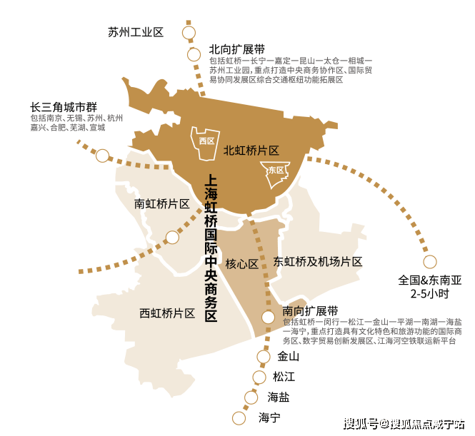 上虹桥依托东西两个片区(西居东产,共计约167公顷),遵循“以人为本、产城融合、多元包容、活力共享”的理念,整体打造创新经济集聚区、中央商务配套区和高品质国际化社区。