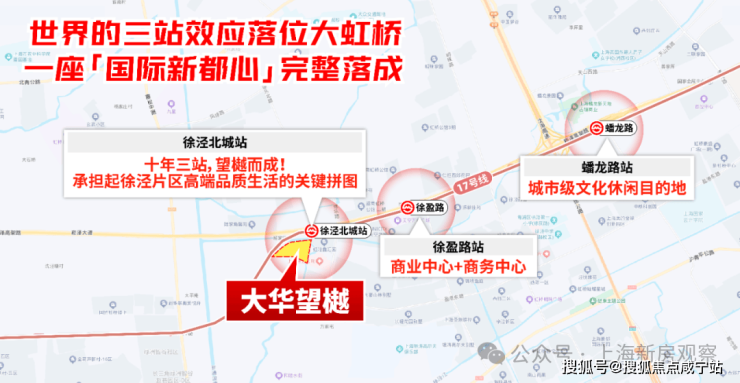 交通当面,项目北侧紧邻17号线徐泾北城站(需绕行河道),1站可达徐盈路天空万科广场,2站至蟠龙古镇商业区,3站直达国家会展中心,4站即达虹桥枢纽。