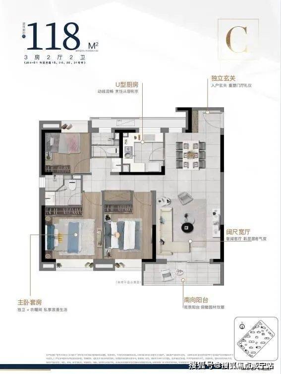 中建·玖海云天目前在售建面约93-133㎡3-4房,其中118平3房是当下户型设计的佼佼者。