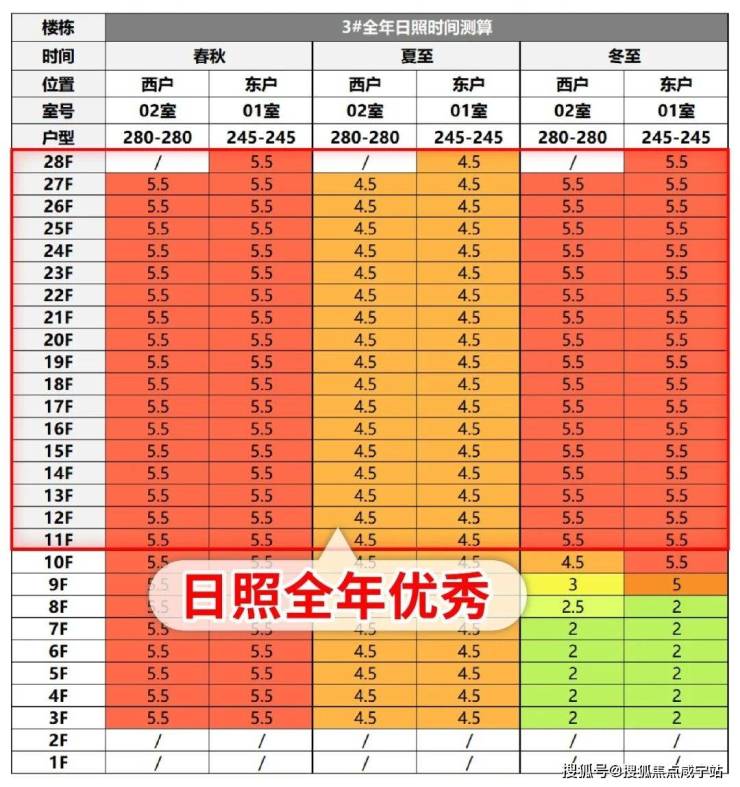 小胖建筑师对3号楼全年日照做了测评,11楼以上几乎全年优秀日照,这在楼栋密集的上海内环内非常少见。